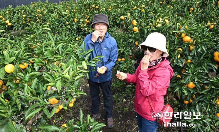 [한라일보] 29일 서귀포시 남원읍 신례리 휴애리에서 노부부가 감귤따기 체험을 하고 있다. 강희만기자