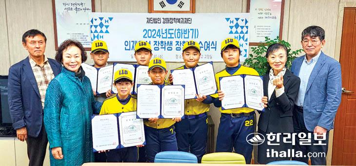 경해장학복지재단(이사장 이경의)은 30일 제주시 소재 제주남초등학교 교장실에서 야구부 인재육성 장학금 전달식을 가졌다. 이날 장학금으로 남초등학교 야구부 6명에게 각 50만원씩 총 300만원이 전달됐다.