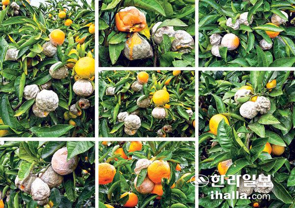[한라일보] 30일 서귀포시 남원읍 신례리 한 감귤과수원에 있는 감귤들이 곰팡이균 피해로 썩어가고 있다. 강희만기자