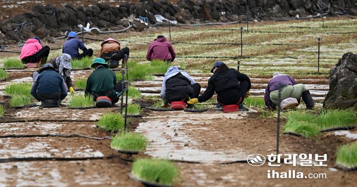 [한라일보] 31일 서귀포시 대정읍 무릉리 한 농경지에서 농민들이 양파모종 파종 작업을 하고 있다. 강희만기자