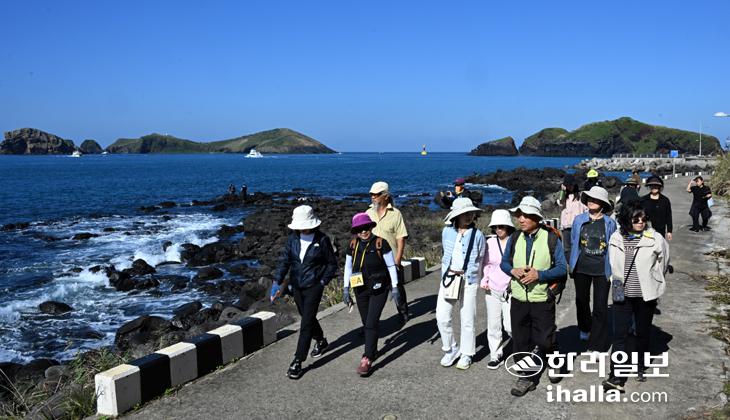 [한라일보] 지난 2일 제주시 한경면 고산리 수월봉 일대서 열린 ‘세계지질공원 트레일’ 행사장을 찾은 탐방객들이 차귀도가 보이는 엉알길을 걷고 있다. 강희만기자