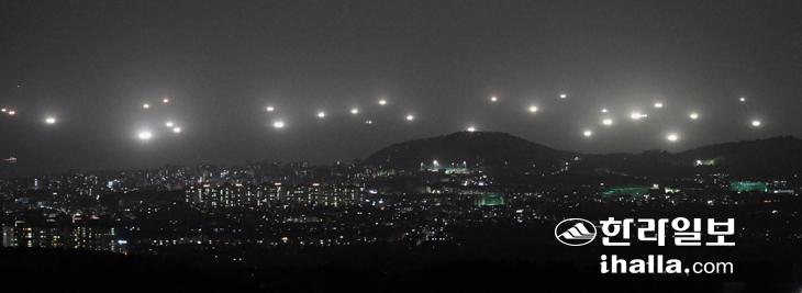[한라일보] 지난 4일 밤 제주시내를 밝힌 불빛과 수많은 갈치어선들이 켜놓은 집어등이 어우러지며 불야성을 이루고 있다. 강희만기자