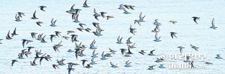 [한라일보] 5일 제주시 구좌읍 종달리 해안에서 민물도요 무리들이 한꺼번에 날아오르며 화려한 군무를 선보이고 있다. 강희만기자