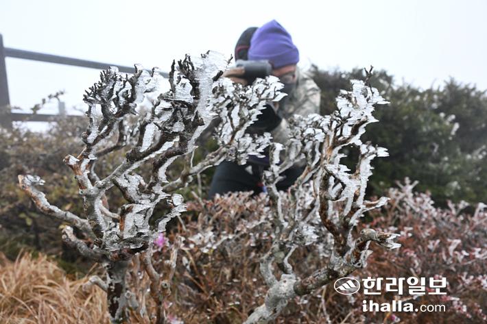 [한라일보] 찬 공기 영향으로 산간지역의 기온이 영하로 떨어지며 올 가을 들어 가장 추운 6일 한라산 윗세오름에 처음으로 상고대가 활짝 피었다. 이날 한라산 윗세오름의 최저기온은 -1.2℃, 한라산 남벽은 -1.0℃를 보였다. 상고대는 대기중의 구름이나 안개 입자들이 나뭇가지나 바위 등에 부딪혀 얼어붙는 현상을 말한다.
