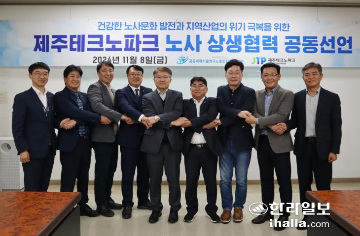지난 8일 제주벤처마루 회의실에서 열린 제주테크노파크 '노사 상생협력 공동선언'에서 문용석 제주테크노파크 원장과 진희철 공공과학기술연구노동조합 제주테크노파크지부장 등이 갈등 해결의 의미를 담아 서로의 손을 맞잡고 있다. 제주테크노파크 제공