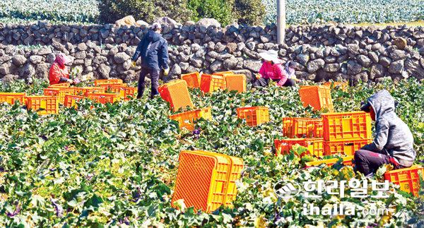 따스한 가을 햇살이 내비친 11일 제주시 한경면 고산리 한 농경지에서 농민들이 콜라비를 수확하고 있다. 강희만기자