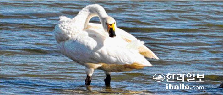 [한라일보] 11일 제주시 한경면 용당리 해안 습지에 겨울 진객인 고니(멸종위기 야생동물 Ⅱ급으로 국가적색목록에 취약으로 분류되어 있으며 천연기념물 201호) 한 마리가 찾아와 휴식을 하고 있다. 강희만기자