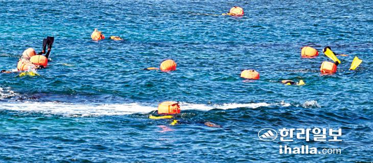 [한라일보] 11일 제주시 한경면 용수리 해안가에서 마을 해녀들이 물질 작업을 하고 있다. 강희만기자