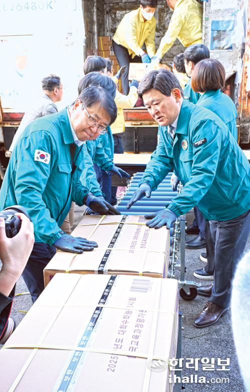 2025 대학수학능력시험을 이틀 앞둔 12일 항공 화물을 통해 수능 문답지가 제주로 이송됐다. 이날 김광수 교육감(오른쪽 첫번째)과 교육청 관계자들이 도착한 문답지를 보관 장소로 옮기고 있다. 강희만기자