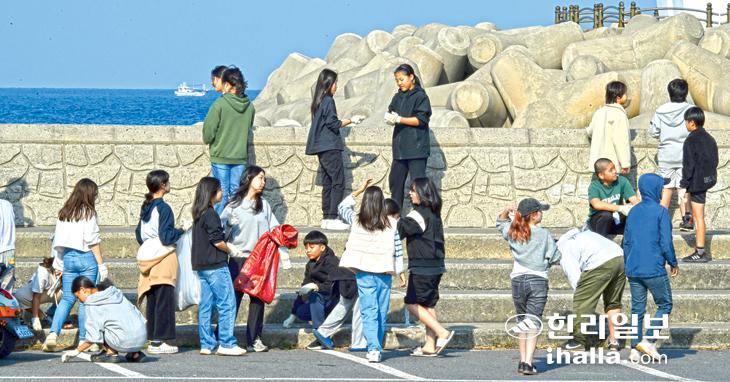 [한라일보] 13일 제주시 이호동에서 오라초등학교 어린이들이 해양쓰레기 줍기 플로깅 활동을 하고 있다. 강희만기자