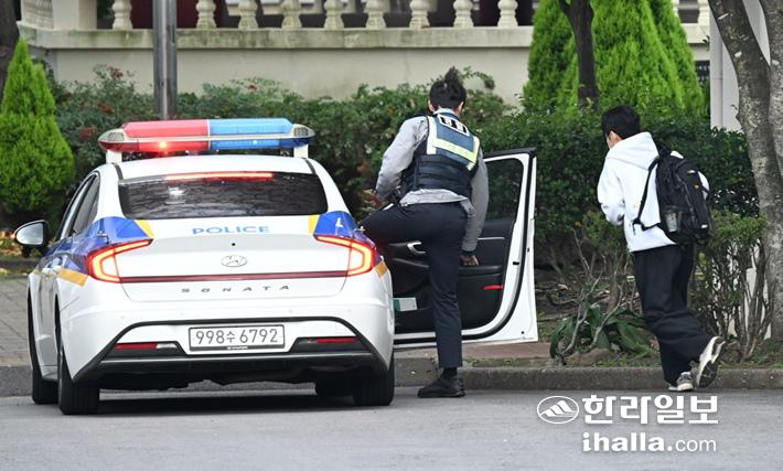 [한라일보] 2025학년도 대학수학능력시험이 치러진 14일 오전 경찰 순찰차를 타고 도착한 한 수험생이 제주시 제주제일고에 마련된 시험장으로 향하고 있다. 제주지역에서는 16개 시험장에서 6900여명이 수능에 응시하며 오후 4시37분에 종료된다.