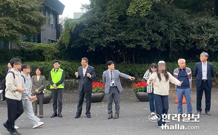 오순문 시장 등이 14일 오전 시험장으로 향하는 수험생들을 응원하고 있다. 서귀포시 제공