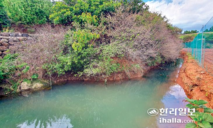 서널개오름 입구의 호강물, 이 도로의 오른쪽에는 소로곳물이 있다. 김찬수