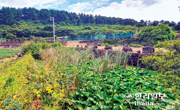 또한 이 주변에는 1950년대에서 1960년대에 걸쳐 2개의 저수지를 만들었다는 기록이 있다. 2000년에 들어서도 만들어졌다고 하니 모두 3개가 있는 셈이다. 그중 가장 오름 가까이에 있는 것이 웃저수지다. 바로 이 개울 같은 골짜기에서 흘러내리는 물을 저수한다. 판포리 883번지를 포함하는 곳이다. 이곳에서 흘러내리는 물은 다시 배수로를 따라 판포리 849번지 알저수지로 흐른다.