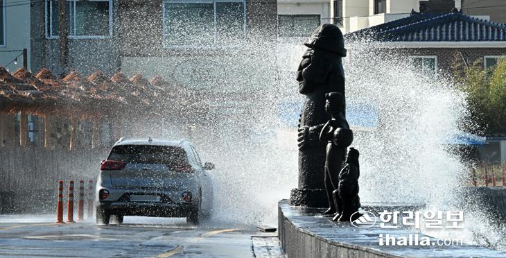 [한라일보] 18일 제주시 한림읍 금능해수욕장에 천문조에 따른 바닷물 상승과 강한 바람의 영향으로 파도가 담을 넘으며 운전자에게 불편을 주고 있다. 강희만기자