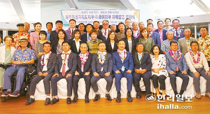 이날 자매결연 협약식에는 제주지부 임원 10명과 하와이지부 이한종 회장 및 임원들과 주호놀룰루대한민국 이서영 총영사를 비롯한 한인 단체장들이 참석했다.