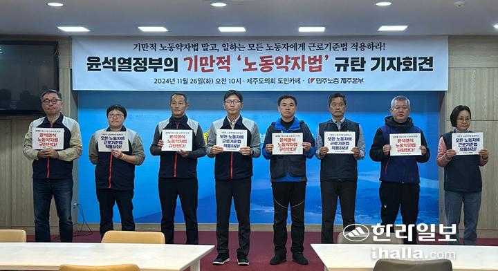 민주노총 제주본부는 26일 제주도의회 도민카페에서 기자회견을 열고 "일하는 모든 노동자에게 근로기준법을 적용해야 한다"고 주장했다.