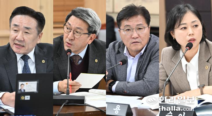 27일 제주도의회 예산결산특별위원회 회의에서 질의하고 있는 양경호, 김황국, 하성용, 이승아 의원. 제주도의회 제공