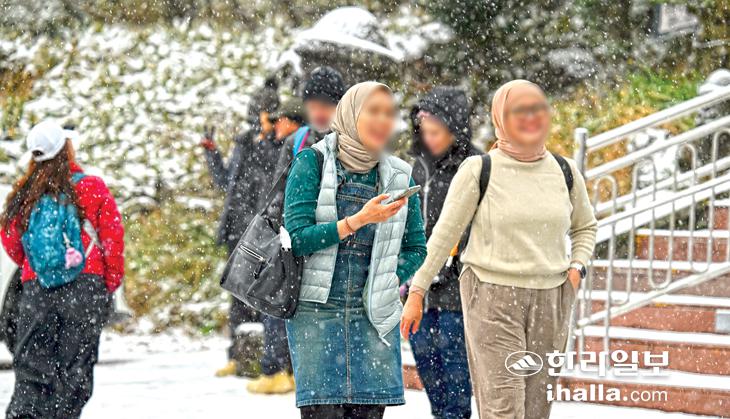 "와~ 첫눈 맞았어"… 제주서 신난 외국인 관광객들