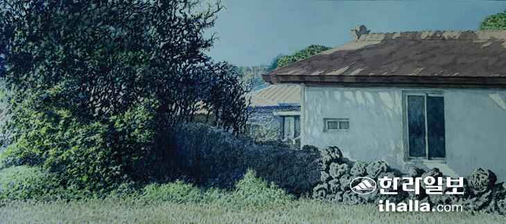 오후 3시의 태양이 나무 그림자를 지붕과 벽에 저렇게 드리울 정도면 얼마나 큰 나무가 무리 지어 있는지 유추가 가능하다. 부지런함을 저 나무처럼 키워온 조상들의 '큰 그림자'를 메시지로 그리고 싶었다. 또한 하염없이 부러운 저 창문을 기록으로 남기고 싶어서 그린 것이다. 겨울 초입이라 가을걷이가 끝난 밭은 쉬고 있지만 낮은 밭담이자 집담을 경계로 저 창문 안에서는 언제나 밭과 나무를 바라보게 되어 있으니 얼마나 안온한 풍경화 속에 살고 있는 것인가? 어떤 그림으로도 충족할 수 없는 현실을 창문에 그려 놓고 살아가는 사람들의 집을 그렸다. 천민자본주의에 찌든 사람들이 지닌 어떠한 돈으로도 살 수 없는 농민의 풍요가 여기 있다. 또한 이곳 농촌이 보유한 힘이라고 느껴지기도 한다. '가까이 있다'는 것보다 월등한 일상성이 어디 있으랴? 눈부신 햇살의 강도를 아이러니하게도 짙은 나무와 그 그림자가 상대적으로 확인시켜주고 있으니 회화적 긴장감이 증폭된다. 지금이 겨울이라고 하지만 초록이 항시 주변에서 함께 살아가는 땅. 그 초록과 함께하는 주인공은 농민이다. 우리는 그저 조연이거나 그 감동의 혜택을 누리는 주변인이자 수혜자에 불과하다. 밭과 나무와 돌담과 집이 화면이라는 무대에서 사중창을 하고 있다. 반주는 태양광선이 하고 있는 저 아름다운 시각적 노래는 한원리 사람들의 행복지수가 얼마나 높은 지 확연하게 보여주고 있으니. 나무와 집이 이토록 아름다운 만남을 보유하고 있는 마을이 참으로 부럽다.