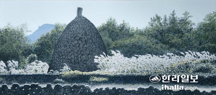 억새들이 손짓이 바쁘다. 기울어진 각도가 보여주는 것은 하늬바람이 심하게 불고 있는 상황. 겨울날 청명한 눈부심이 역광으로 억새를 더욱 화려하게 수놓고 있다. 윤슬처럼 반짝이는 저 군무의 동작은 경쾌하고 가볍다. 그 가벼움에 날아갈까 염려되어 묵직한 돌들로 방사탑을 쌓은 것이리라. 나무들의 겨울을 표현하기 위하여 담채스타일로 까칠하고 건조하게 그렸다. 주인공인 억새를 마치 오페라의 합창단처럼 뒤에서 화음을 넣게 하였다. 멀리 희미한 푸른 빛으로 당산봉의 한 귀퉁이가 보이게 한 것은 이 위치가 어디라는 것을 파악할 수 있도록 배려(?)한 것이다. 밭에서 그린 그림이라는 것을 알 수 있는 것은 밑에 줄지어 쌓여 있는 짙은 밭담과 그 뒤에 농로가 있어서 확인이 가능하다. 그리 크지 않은 밭들이지만 그 밭과 밭 사이를 지나가며 모두를 이어주는 농로의 아름다움이 이런 시각적 관점에서 표현하게 하였다. 그냥 지나칠 수 있는 것들의 놀라운 아름다움을 이 겨울풍경을 통하여 확인하고 싶어서다. 가로 방향으로 흐르는 시간성 속에서 방사탑은 그 시간을 잠시 멈추고 뒤를 돌아보게 하는 위력을 지닌 듯하다. 저 돌탑 쌓이는 과정이나 이 마을이 이룩되어 온 과정이나 동일한 속성을 지녔음이 상징적이다. 토대를 마련하고 차곡차곡 돌을 하나하나 쌓아간 세월들. 밑돌이 없이 윗돌이 쌓일 수 없는 원초적 인과율을 무언의 메시지로 환기시켜고 있으니 그 성실성 앞에 삿됨이 범접 못하는 것. 우직한 농심이려니.