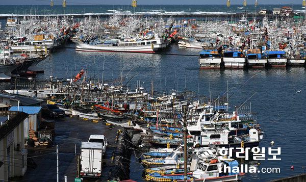[한라일보] [한라일보] 제주 해상에 풍랑경보가 내려진 28일 제주시 한림읍 한림항에 어선들이 대피해 있다. 강희만기자