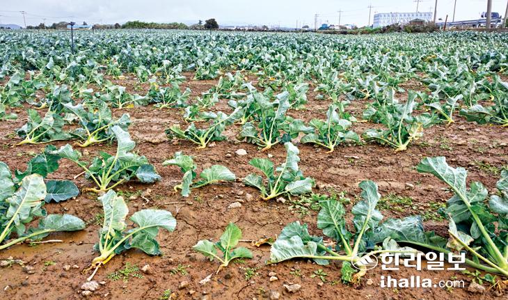 [한라일보] 28일 서귀포시 대정읍 한 농경지에 심어진 브로콜리가 강풍에 뿌리가 뽑히는 피해를 입었다. 강희만기자