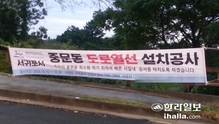 중문동 도로 열선 설치 기간에 내걸렸던 공사 안내 현수막. 한라일보 DB