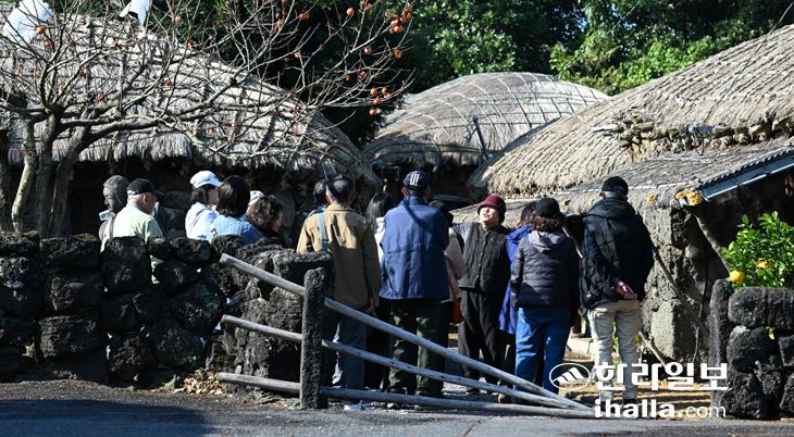 [한라일보] 2일 서귀포시 표선면 성읍민속마을을 찾은 관광객들이 초가 앞에서 마을해설사의 설명을 듣고 있다. 강희만기자
