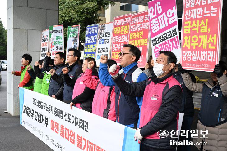제주학교비정규직연대회의(전국공공운수사회서비스노동조합 교육공무직본부 제주지부, 전국학교비정규직노동조합 제주지부)는 3일 제주도교육청 앞에서 기자회견을 열고 6일 총파업 돌입을 선포했다.