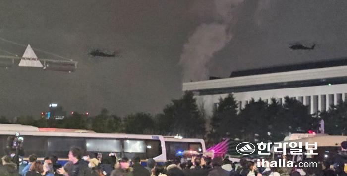 3일 밤 계엄령이 선포된 직후 국회 주변 상공에 군 헬기가 비행하는 모습. 부미현 기자