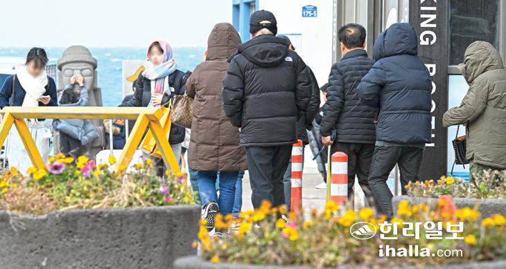 [한라일보] 쌀쌀한 바람이 불면서 초겨울 날씨를 보인 5일 제주시 이호해수욕장을 찾은 관광객들이 두꺼운 외투로 무장한채 걸어 가고 있다. 강희만기자