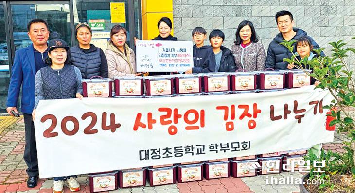 대정초등학교학부모회(회장 한혜진) 회원 일동은 지난 4일 서부종합사회복지관에서 교내 어려운 학생들을 위한 김치 나눔 행사를 열었고 5일에는 서귀포시 대정읍사무소(읍장 한분도)에 방문해 취약 계층에게 전달해 달라며 김치 85박스를 기탁했다.