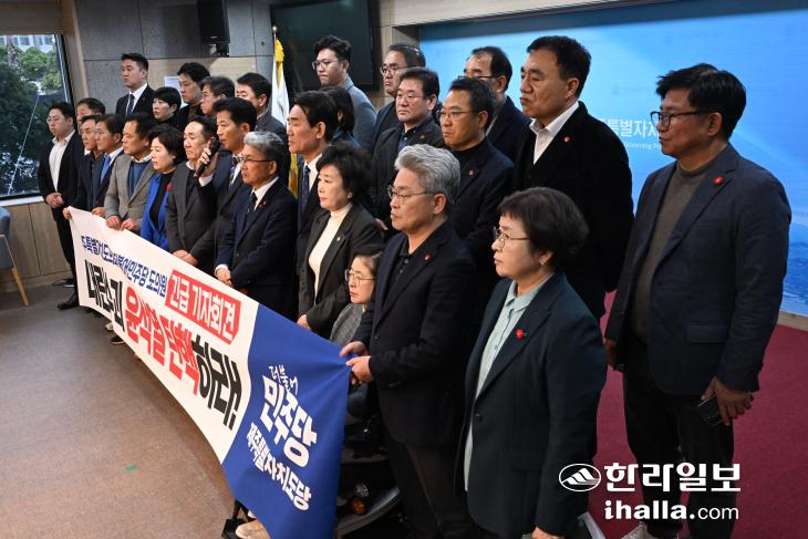 9일 기자회견을 하는 더불어민주당 소속 제주도의원.