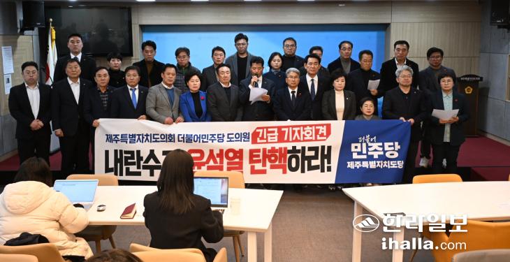 제주도의회 더불어민주당 도의원들이 9일 도의회 도민카페에서 기자회견을 열고 대통령 탄핵 절차에 동참할 것을 국민의힘에 촉구하고 있다. 강희만기자