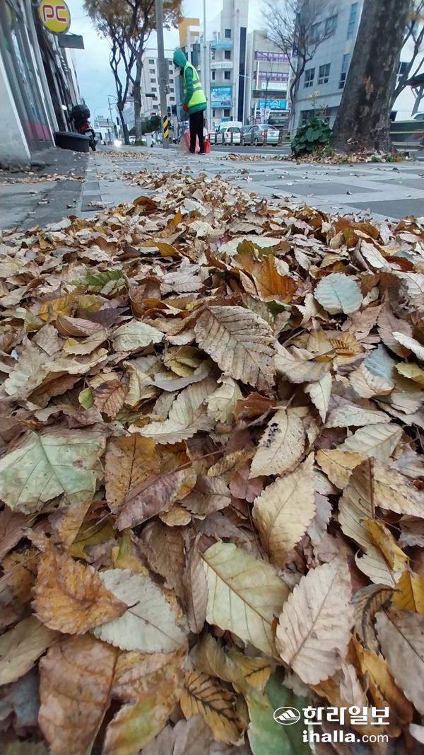 [한라일보] 초겨울 날씨를 보인 10일 제주시 서사로 일대 가로수에서 떨어진 낙엽이 계절의 변화를 알려주고 있다. 강희만기자