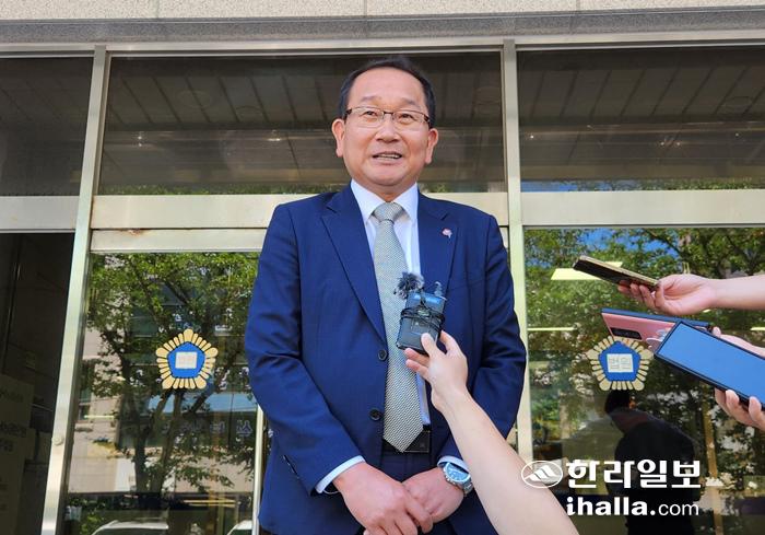 법원 나서는 강병삼 전 제주시상. 한라일보DB