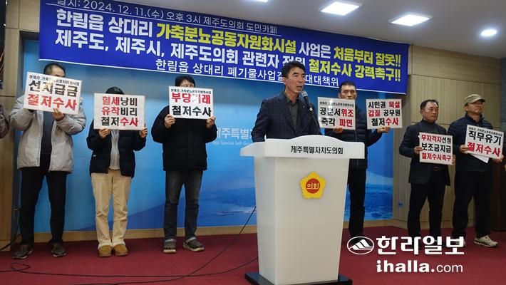 한림읍 상대리 폐기물사업 결사반대 대책위는 11일 제주도의회 도민카페에서 기자회견을 열고 "수사기관은 해당 의혹을 받는 관련자들에 대해 엄격하게 수사해야한다"고 주장했다.