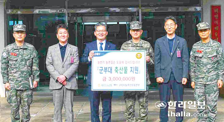 제주농협(본부장 윤재춘)과 나눔축산운동본부 제주특별자치도지부(지부장 김용관, 서귀포시축협 조합장)는 지난 6일 해병대 제9여단(여단장 박승일)을 방문해 300만원 상당의 돼지고기를 전달했다.