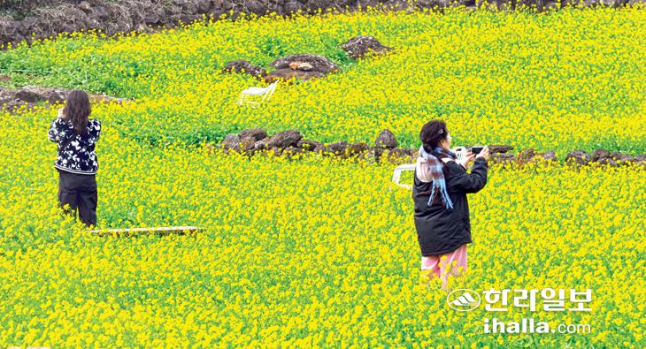 [한라일보] 11일 서귀포시 성산읍 한 유채꽃밭을 찾은 관광객들이 만발한 유채를 배경으로 사진을 찍고 있다. 강희만기자