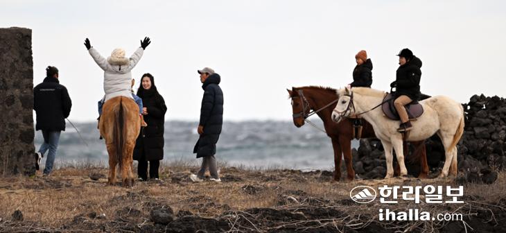 [한라일보] 지난 14일 제주시 한경면 신창리 해안가를 찾은 관광객들이 승마체험을 하고 있다. 강희만기자