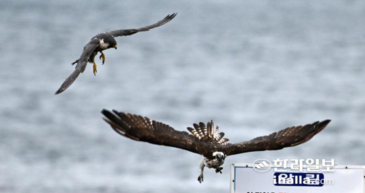 [한라일보] 16일 서귀포시 대정읍 해안도로 해안에서 물수리(멸종위기 야생생물)와 매(천연기념물 제323호)가 쫒고 쫒기며 영역다툼을 하고 있다. 강희만기자