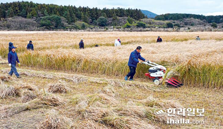[한라일보] 17일 서귀포시 표선면 성읍민속마을 야초지에서 마을회 관계자들이 성읍민속마을 초가에 쓰일 띠(새) 베기 작업을 하고 있다. 강희만기자