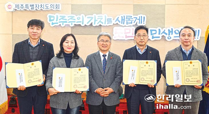 제주자치도의회는 19일 의장실에서 올해 하반기 의정홍보 우수부서 시상식을 열었다. 우수에는 농수축경제전문위원, 장려에는 행정자치전문위원이 선정됐다.