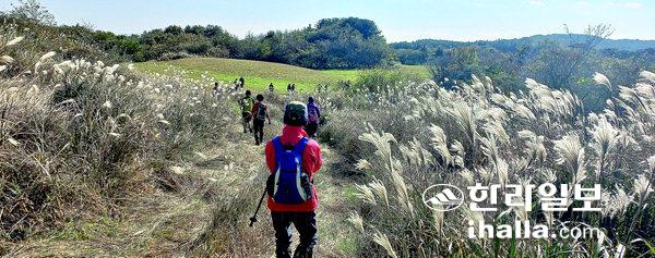 지난달 30일 '2024 제주섬 글로벌 에코투어' 15차 행사가 열렸다. 올해 마지막 행사에 참여한 참가자들이 제주시 조천읍 선흘리 백화동 마을을 출발해 전세미못을 거쳐 은빛물결이 출렁이는 목장길을 걸으며 늦가을의 정취를 만끽하고 있다. 오승국 시인