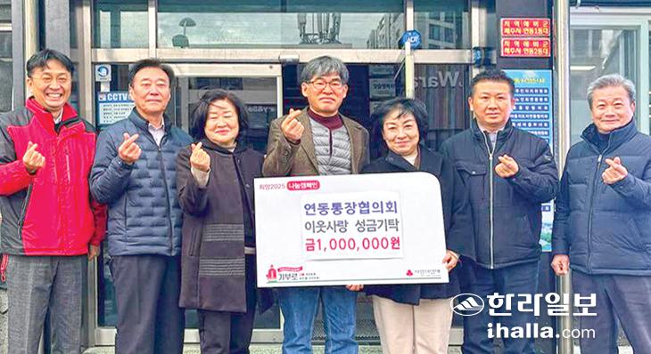 제주시 연동통장협의회(회장 김상현)는 지난 18일 지역 내 취약계층을 위해 써달라며 연동주민센터(동장 원훈철)와 연동지역사회보장협의체(위원장 신애복)에 이웃사랑 성금 100만원을 기탁했다.