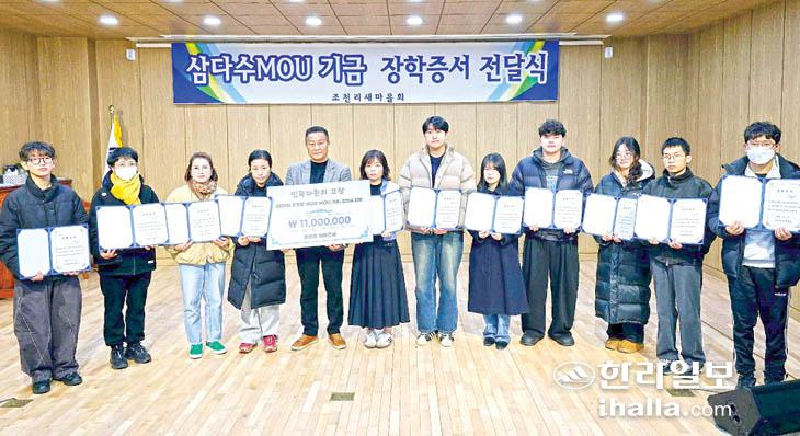 조천리새마을회(이장 박재영)는 지난 21일 조천주민교류센터에서 조천리 삼다수 MOU기금 장학금 전달식을 열고 11명에게 각 100만원씩 총 1100만원을 전달했다.