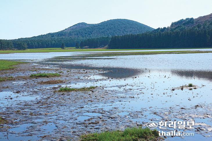 칡오름(오른쪽) 앞의 넓은 호수, 왼쪽 오름은 민오름이다(2016년 3월 촬영).