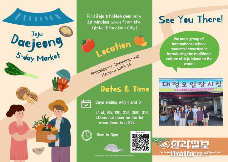 [한라일보] 제주 서귀포시 대정읍 영어교육도시 국제학교 학생들이 대정오일시장 알리기에 나서고 있다. 언어 장벽으로 시장 정보를 접하기 어려운 외국인들을 위해 영어, 중국어 웹사이트를 구축한 것이다.