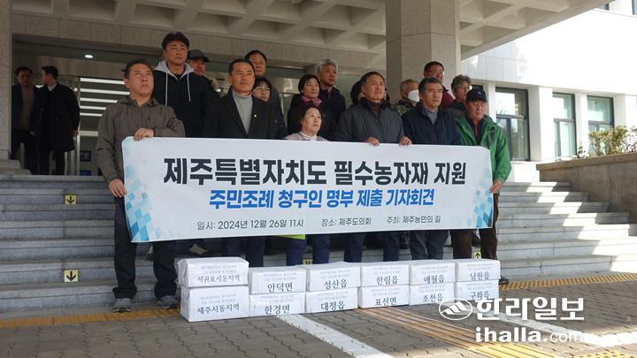 제주농민의길은 26일 제주도의회 앞에서 기자회견을 열고 필수농자재 지원 조례 제정을 촉구하고 나섰다.